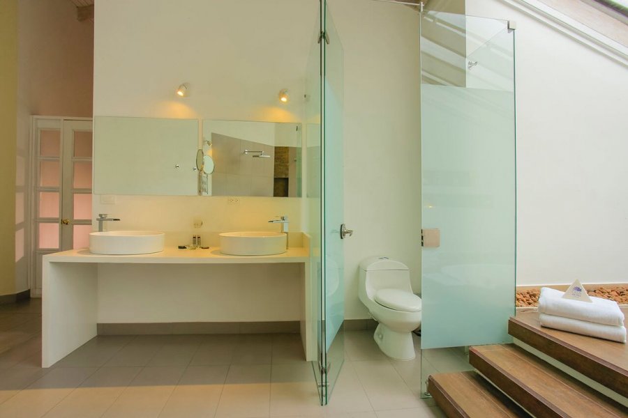 Nuestra espectacular suite Triángulo cuenta con un área total de 76 m2 (30 m2 de habitación principal, 12 m2 de habitación auxiliar, 28 m2 de baño y 8 m2 de balcón privado). Los grandes ventanales ubicados en la habitación y en el baño ofrecen una agradable vista hacia el hermoso paisaje del Quindío.