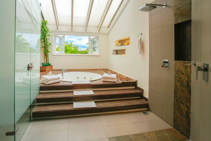 El baño está equipado con dos duchas de lluvia, dos lavamanos, un sanitario y una elegante bañera con sistema de hidromasaje.