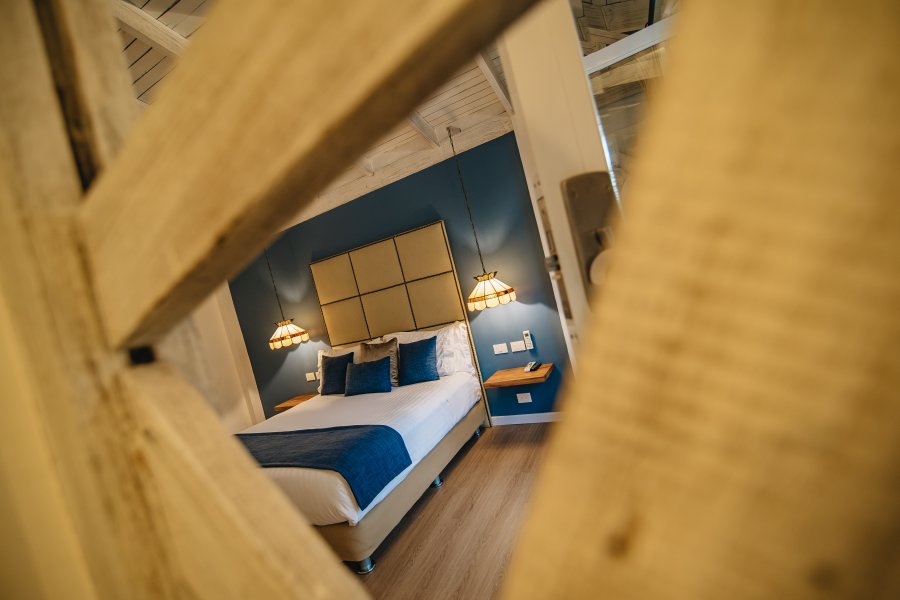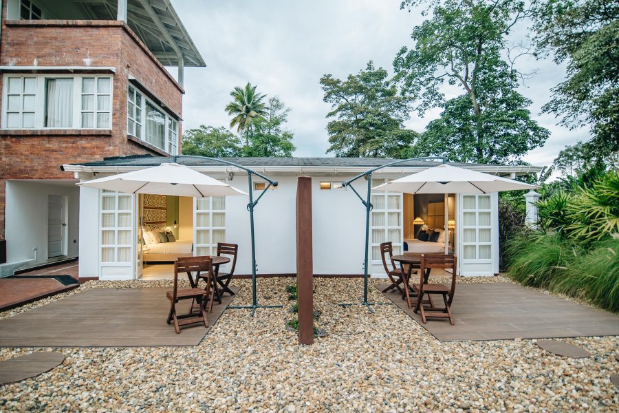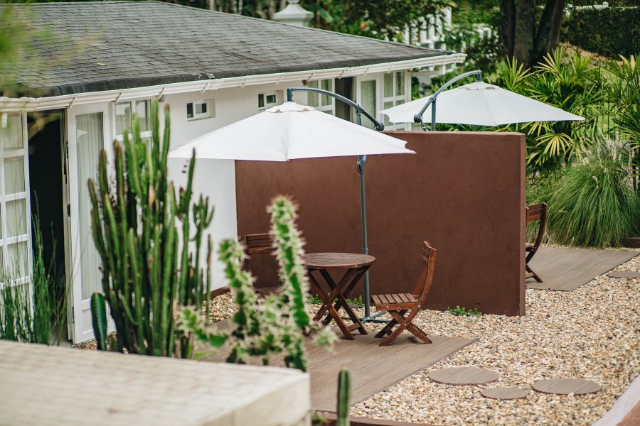 La habitación Ovalo cuenta con 29 m2 (20 m2 de habitación y 9 m2 de terraza privada con vista a la piscina) llenos de lujo y estilo. Los tonos verdes agua de su decoración hacen un perfecto contraste con el verde de los jardines y el azul de la piscina.