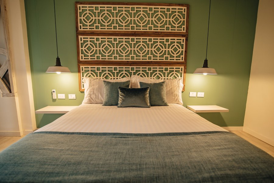 La habitación Rombo cuenta con 31 m2 (22 m2 de habitación y 9 m2 de terraza privada con vista a la piscina y jardines) llenos de lujo y estilo. Los tonos azules de su decoración hacen un perfecto contraste con el azul de la piscina y el cielo.