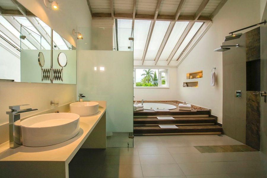 El baño está equipado con dos duchas de lluvia, dos lavamanos, un sanitario y una elegante bañera con sistema de hidromasaje.